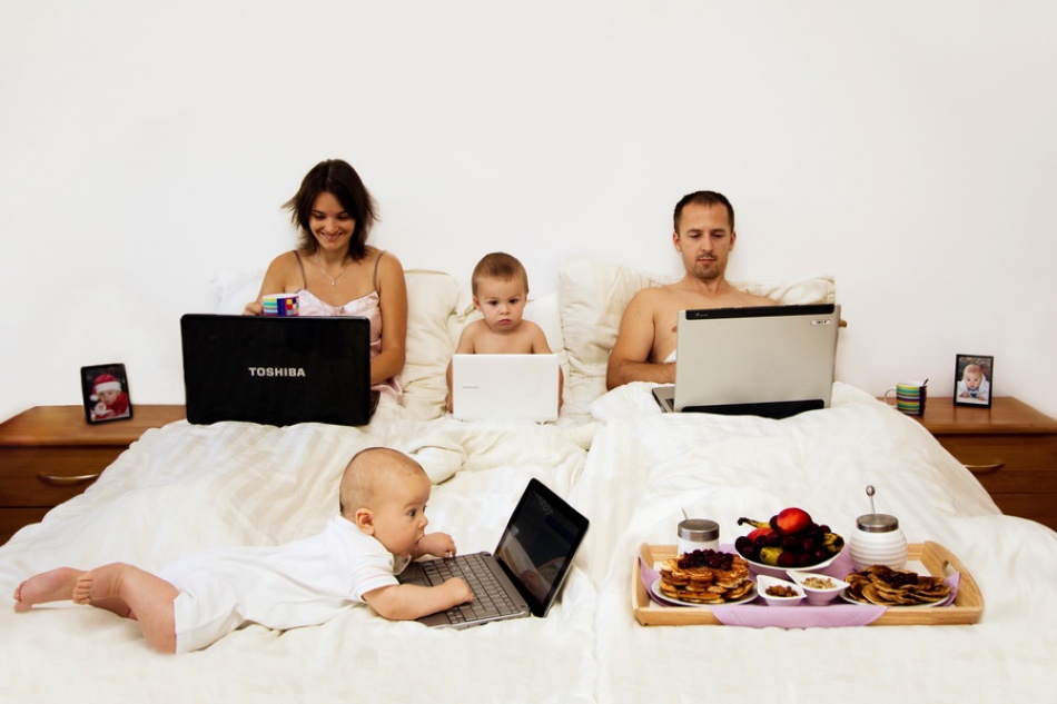 The older boy and dad had to be shirtless to show that it was a cozy, warm environment. The coffee cup in Mom’s hand was essential to show that she was actually enjoying her breakfast in bed. Dad’s cup on the nightstand showed that he was too busy checking the news. The baby had to be put on his belly when everything was almost ready for shooting, because little kids that age (three months) get tired very quickly. Otherwise, by the time I got everyone ready and in position, he may have been lying on the laptop instead of looking at it.