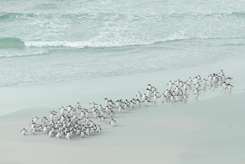 I have two images that are my most favourite because of my emotional connection to them The first photograph was taken in the Falklands. I was on a high cliff overlooking the beach. I spotted a raft of 60 or more so Rockhopper penguins coming ashore. Once they reached the shore they all started running to go their nests up on the cliff. I was so emotionally moved to see so many of them running on the beach to do the steep climb. It was an overwhelming moment to see this beautiful animal scape. This image won 1st prize in 1x.nature monthly theme.
